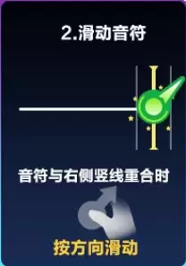 绿色带箭头的音符为滑动音符。当滑动音符进入判定区后,车手需按照箭头的指示方向滑动手指。