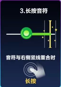 浅绿色带拖尾的音符为长按音符。当长按音符的一端进入判定区后,车手需要长按音符至音符结束。