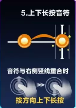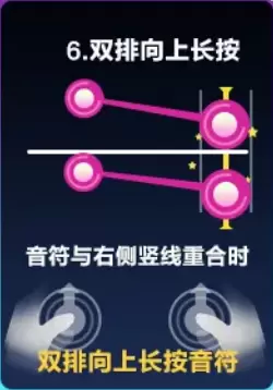 红色双排音符的为双排斜向长按音符。当双排斜向长按音符进入判定区后,需要车手根据音符的方向滑动手指。