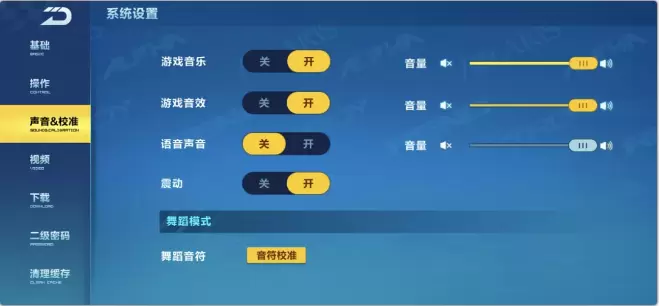 1、在系统设置界面,选择【声音&校准】页签,点击舞蹈模式下的【音符校准】,可以进行音符校准,让音符打击更精确!