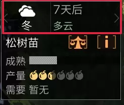 不同天气将直接导致松果的产量变化,如小雪是唯一一个增产的天气,小雨天气下作物将加速生长,因此需及时关注天气预报,挑选适宜的时机种植打理松树苗哦。