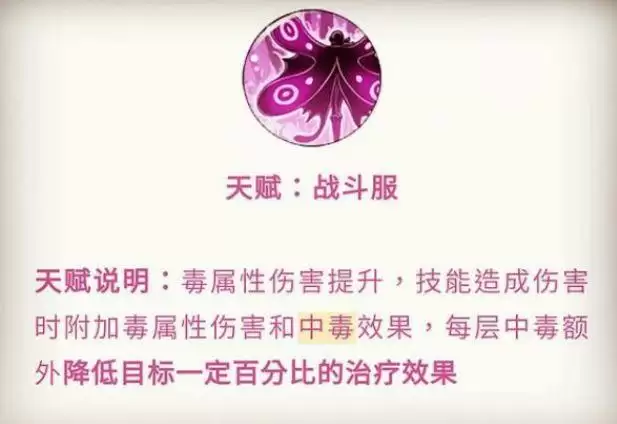 这个天赋挺不错的,给了技能额外附加的毒伤,还有中毒致死效果。基本的输出方面有了保障,同时一手降低治疗,对于有回血能力的角色,可以起到很不错的限制作用。