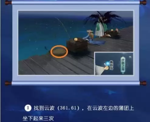 然后,正常流程是去鱼跃岛找云波,这个时候他很专注不会理你,你只需要走到他旁边的简团上坐下来(聊天框上面有个交互-单人动作-坐),坐一次看一次动画,共三次。