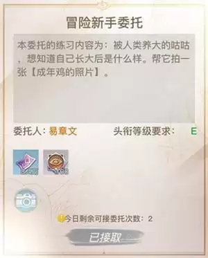 天谕手游有玩家接取了冒险新手委托任务长大之后,需要玩家找到成年的鸡,并为其珀一张照片,天谕手游长大之后委托怎么完成,成年鸡的照片在哪里珀,游乐小编来为大家介绍。