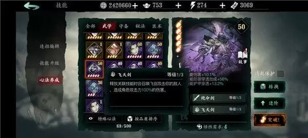 心法分为四大种类:武学、守备、秘法、医术。