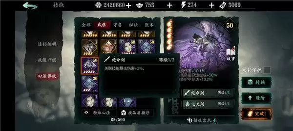 藏剑门主: 1绝技增强关联技能暴伤,2绝技辅助输出。