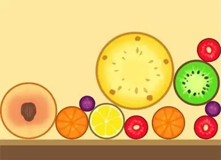 1、在游戏中的顶部醋香相关的水果,每种水果的大小各不相同。
