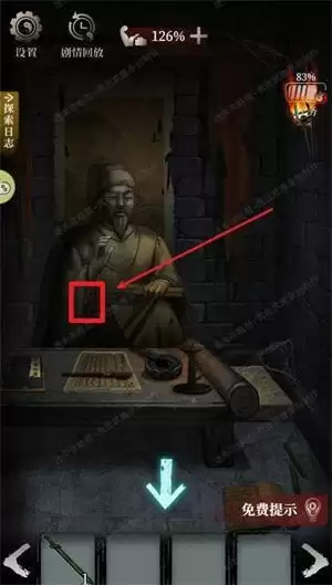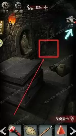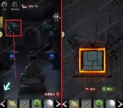 7、点击右上角的箭头前往下一个场景。来到新场景之后选择物品栏中的刻刀点击左边石像上的白色石头,获得白色五行石。