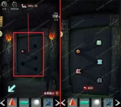 9、点击场景中间放有宝石的石门,触发剧情。剧情结束之后按照图中标注在对应位置放入相应颜色的宝石,石门打开。