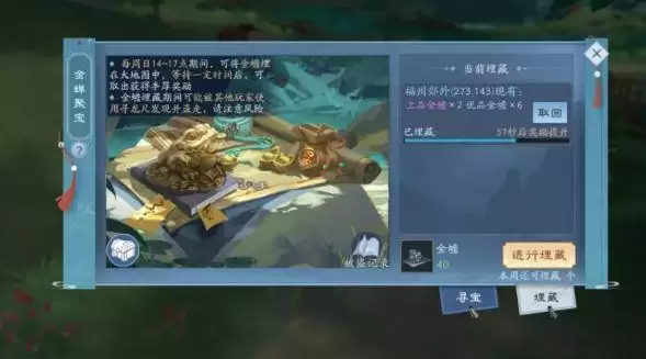 在江湖各处埋下金蟾,收获惊喜吧!【金蟾寻宝-埋宝】在活动中可以得到金蟾。得到之后可以选择直接使用,将会获得少量奖励,也可以选择将其埋下,静待惊喜……