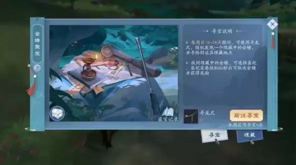 活动上线后的每周日15:00~24:00期间,可使用【寻龙尺】道具进行盗宝。盗宝时将随机发现一个当前处于埋藏中的金蟾,并寻路到其埋藏地点!找到埋藏中的金蟾,可选择是否进行盗挖。若选择放弃,则归还【寻龙尺】道具。若选择盗挖,则需要在埋藏位置挂机等待60s,取出金蟾,获得奖励!