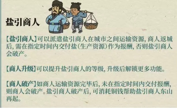 如商人运输资源完毕后,未在指定时间内交付报酬则商人会破产.盐引商人破产后,可消耗铜钱帮助盐引商人东山再起.