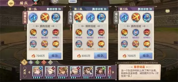 此次还是灵活调整之后,我们利用更多的时间来把战魂培养到可行就可以,稀有装备一般都是比较难获得,因此我们这里还是给出一个比较万搭的机制,主要还是破釜沉舟等重要的搭配模式,能够更好的应对多个队伍,在神兵的搭配之下,可以得到很多不同的玩法,巧搭之后,一般都是携带了弓箭、葫芦还有其它普通对敌机制。诸葛亮的出场只能限定一次,所以在合理的控怒之后,阵容上可能要多做调整,目前不用羽扇,而是用的斧头,高精炼的和氏璧也是有着较高的属※加成。