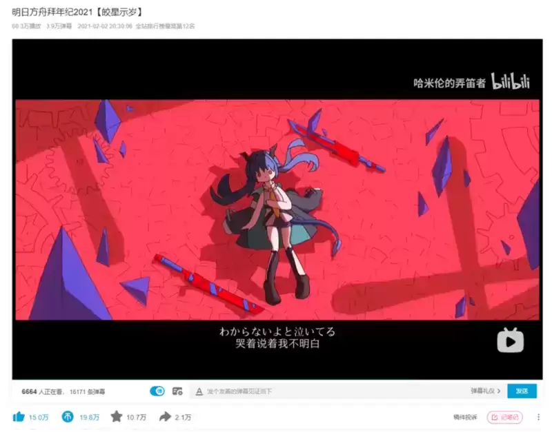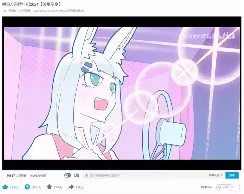 在2021年2月3日凌晨1点37分,我写下这句话时,依然有接近7000名观众在B站(哔哩哔哩弹幕网)观看名为“明日方舟拜年纪2021【皎星示岁】”的视频,通过弹幕和评论与来自全国各地的明日方舟游戏玩家们分享自己的感触。