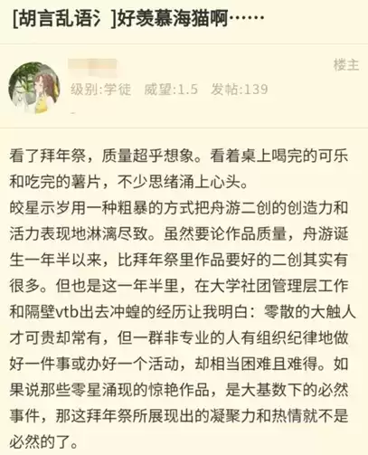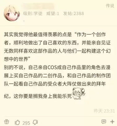 当然,不是所有同人创作都能以用爱发电来一概而论。在我所见的视野内,有些作者本身还是在校的学生,会面临对生活、对未来职业规划的考量,同人既是他们展现自我才华的舞台,同时也是他们为圈子做出贡献和挣得更多机会所做的必然选择。
