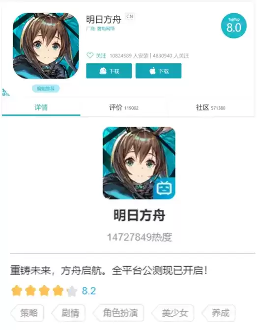 例如哪怕运营的时长已经接近两年,在Taptap以及B站,明日方舟却依然持有高达8.0和8.2的玩家评分,B站、微博、NGA、毕方以及知乎……各大玩家社区从游戏攻略、同人创作、剧情梳理、人物解读、考据科普到沙雕栏目,形成了非常系统的基础创作生态。