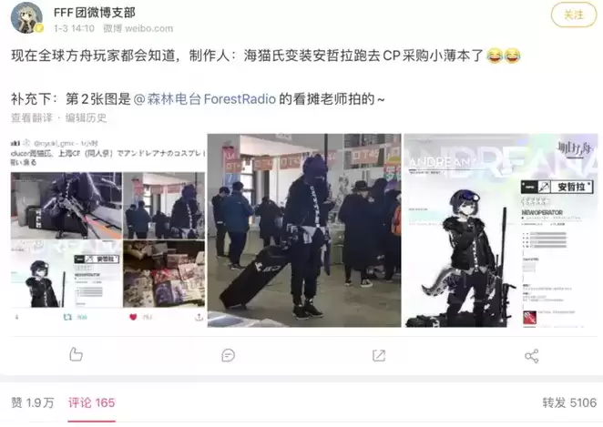也许是因为有过同人作者的经历,身为游戏制作人海猫络合物老师,对明日方舟的玩家二创给出了很大的认可力度,甚至还在CP27上COS成安哲拉采购同人本。