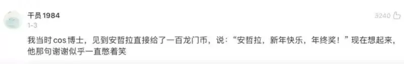 在明日方舟,游戏制作人与我们这些玩家近距离接触的例子比比皆是。同样是CP27,当时还闹出过“玩家给游戏制作人发年终奖”的笑话,说的是有人在CP上COS成博士,稀里糊涂地给海猫老师COS的安哲拉发放了100元龙门币奖励(游戏周边道具)。