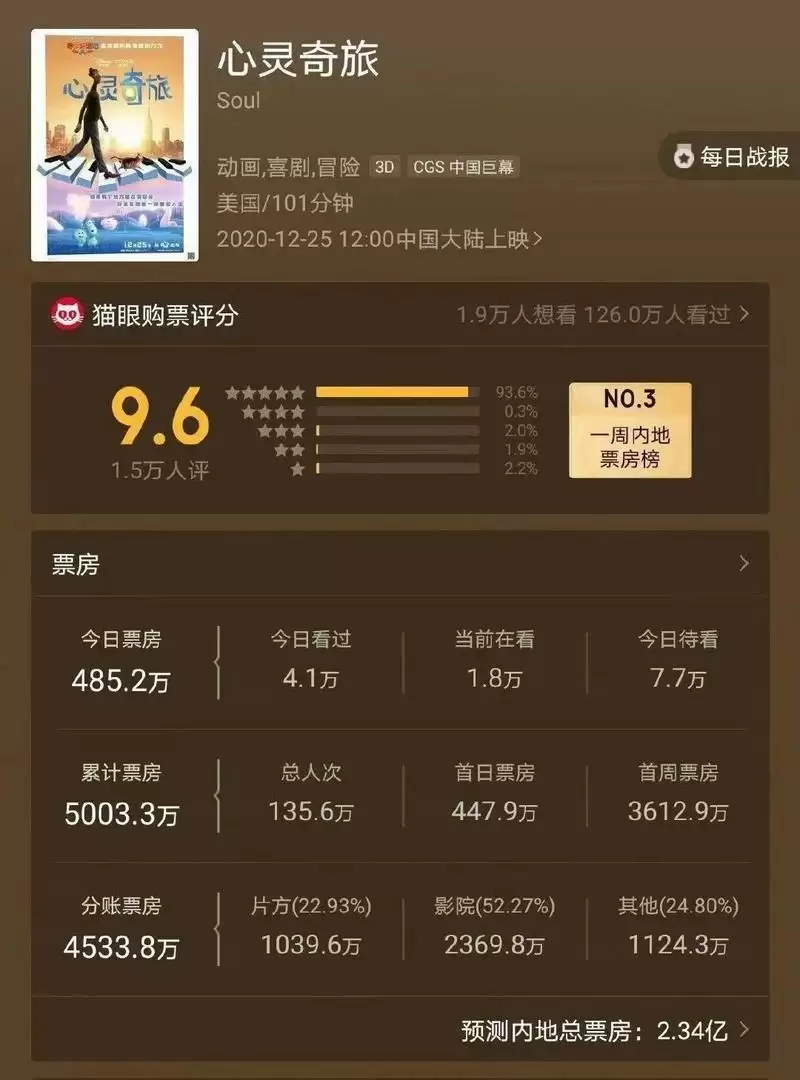 豆瓣开分9.2,猫眼9.6在初期排片儿不足5%的情况下,截止2021年1月1日,票房突破5000万这部来自皮克斯的,无比诚挚的作品,留给观影人的绵长余温,也值得我们再来专门说道一次。