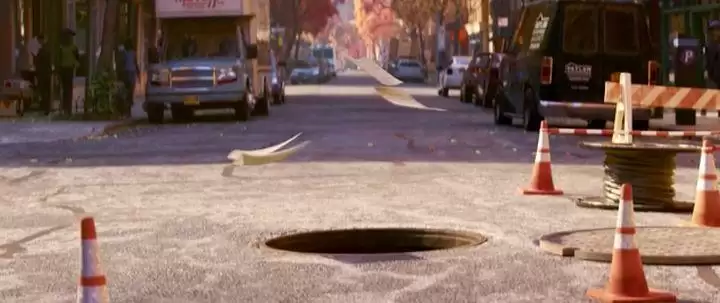 在Joe初次进入Zone(忘我之境),嬉皮打开两界大门,让他心思想像自己在哪,他闭眼首先出现的是地球,其次是纽约曼哈顿岛的白天空景,最后是自己躺在病院的身躯,从外至内Zoom in(推镜头)。