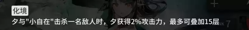 化境化境:夕与"小自在"击杀一名敌人时,夕获得2%攻击力,最多可叠加18(+3)层。
