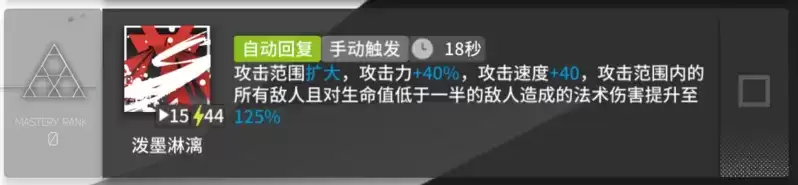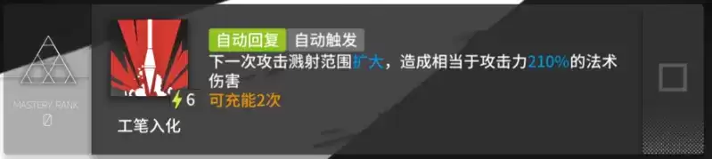 技能在面对多波次敌人入侵时尤为强力,输出效果一般但是对于整体阵型的巩固可以起到至关重要的作用,在保证干员生存环境的情况下还在做到一定的法伤补充。