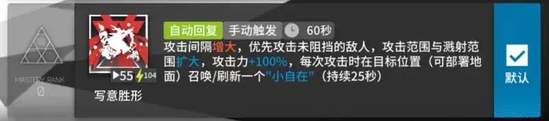 写意胜形写意胜形:攻击间隔增大(+40%),优先攻击未阻挡的敌人,攻击范围与溅射范围扩大,攻击力+120%,每次攻击时在目标位置(可部署地面)召唤/刷新一个"小自在"(持续25秒)。