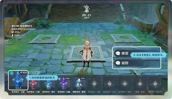 在建造阶段,界面上方会开启倒计时,旅行者们可以利用这段时间来规划战术,建造机关。此时本轮魔物的行进路线会在地面上预先指示。