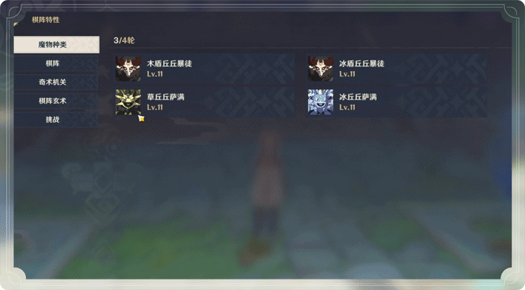 在挑战过程中,旅行者们可以随时查看棋阵特※,包括本轮挑战会出现的魔物种类、本局棋阵、奇术机关的详细信息、本局已选择的棋阵玄术、棋阵挑战。(PC端按【U】键、移动端点击「棋阵特※」图标、PS4端长按【L1】键开启快捷轮盘选择「棋阵特※」图标,即可开启棋阵特※页面)