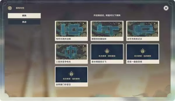 解锁「机关棋谭」玩法后,旅行者们将面对以下棋阵,随着「节庆热度」达到不同阶段,旅行者们可解锁更多的棋阵。