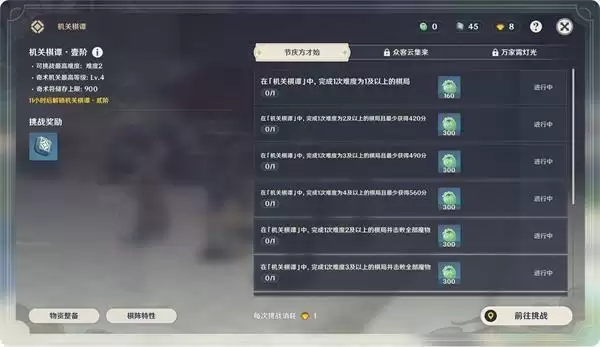 旅行者们可以在机关棋谭活动页面中查看挑战任务。累积节庆热度可以解锁后续阶段的挑战任务。每完成一项任务,都可以获得相应数量的「平安玉符」。