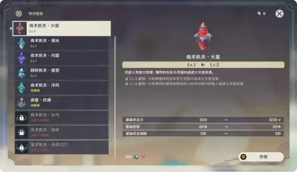 在局外的「物资整备」页面中,旅行者们可以消耗「奇术符」来解锁新机关和升级已有机关。