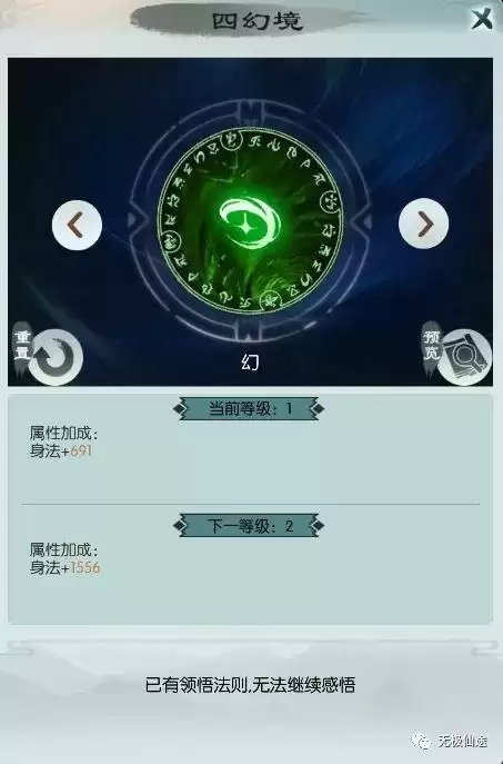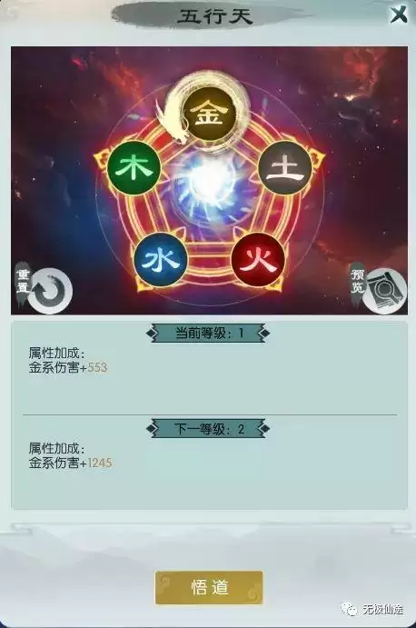 共有金木水火土五行法则可供参悟,参悟后可提高对应属性的伤害,同四幻境一致,只能选择一法则进行参悟。