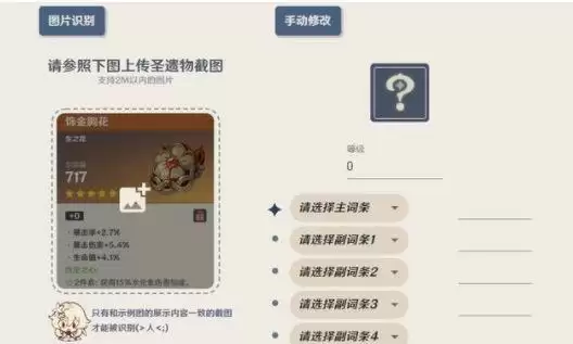 操作方法:只需要把自己圣遗物的截图传到左边的框中就可以对圣遗物进行评分,如果截图不方便的话,也可以在右侧手动输入自己圣遗物的相关属性。