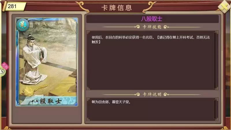 1、需要使用八股取士的回合,先开启丞相辅政,在丞相辅政界面使用策卡,存档后不停上朝sl即可。科举改革和特奏名需要自己计算保底名臣出现的回合,当保底名臣要出现时同样开启丞相辅政sl。