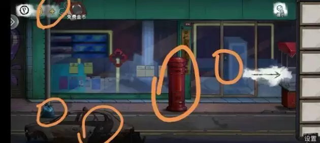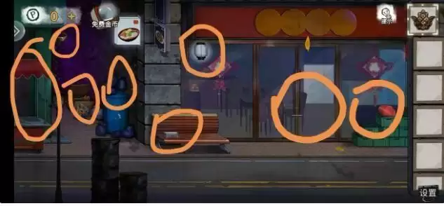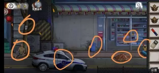 流浪汉要吃肉串,树上有提示,警车里有红色卡片和数字密码,垃圾桶里是机关盒,翻开树叶堆的右下角找到铜块,超市门需要密码。往右拉还有一个摇摇车和一辆大运摩托。