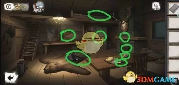 双圈里的数字×2与单圈里的数字相加,密码是6879,打开营地木屋左边柜子里的密码盒,取得锥子。