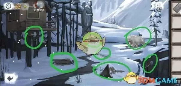 拾取地上的石像,放在右边的台子上得到滑块,台子右边有把碎石块,捡走。树干中间有半把剪刀,上面有鸟巢。用滑块打开树屋楼梯上的机关拾取雪鞋,组合剪刀剪开袋子得到浮雕。用浮雕打开小木屋衣柜里的眼形凹槽盒子获得滑雪杖。