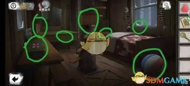 窗台上有开瓶器,鱼骨的数量是打开小木屋密码盒的提示。点击地上的球,用开瓶器打开木板,拾取吸盘箭,点击欠条查看对话。