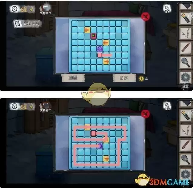 先把红色方块移动到循环箭头上,再按照图示去调整。拾取金属徽章和六角扳手。