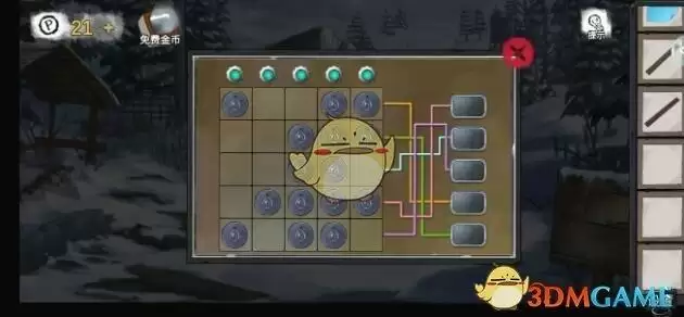 拾取冰冻的石头旁边的三角形按钮,把方形石块安装在神像脚下的圆盘上,拾取圆盘边的钥匙。按照圆盘左边的提示摆成如图,解开机关得到圆形按钮。