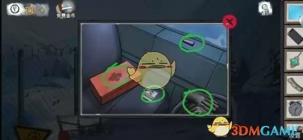 把右下角的铁桶滑动移开,用箭取出小孔里的钥匙,滑动左边的铁桶,后面有闹钟,取出闹钟里的电池,铁桶下面门上的插销锈住了。用钥匙打开车门,点击照片,拾取皮手套,用吊坠打开盒子获得半把钳子,开关陷进去了。