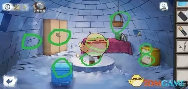 桌上的红色盒子里拾取酒精,操作取得嵌片,嵌片装在盒子里取得滴管,然后把盒子点到如图所示的位置,点击右边的红色卡扣打开,获得线索照片。给桌子上的煤油灯灌酒精,用放大镜点燃,拾取煤油灯在雪屋照亮床底,看到提示。
