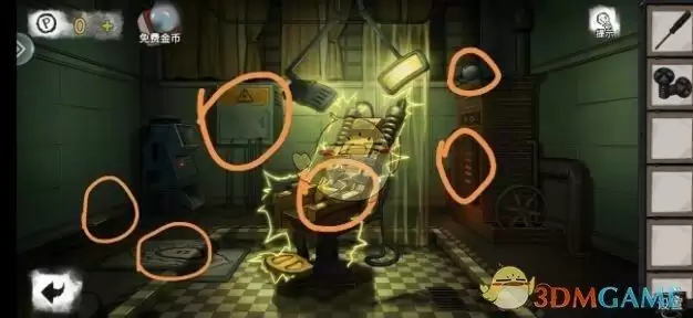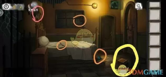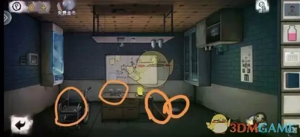 调查黄色处,分别是画,医用口罩,松动的地砖,得到按钮。床上有第一个小游戏打开得到螺丝刀柄。