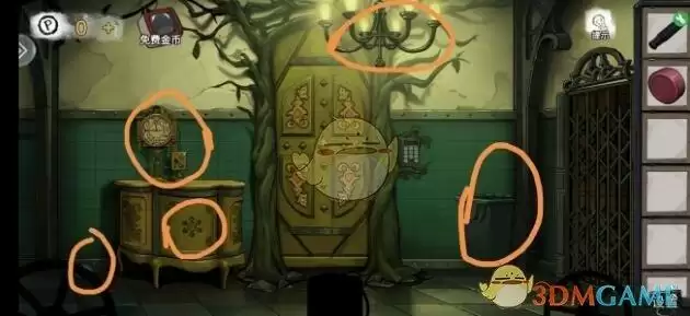 用玻璃碎块划开走廊里调查过的画,得面具碎块,组合后在卧室床头柜处使用,获得指针,安装在走廊钟表上,根据纸片上的提示解锁。