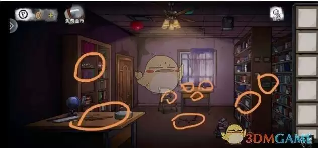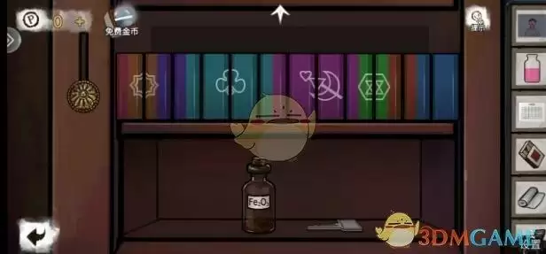 图附书柜一层的摆法,二层需要其他房间的提示,三层缺少书本。桌上有发卡可以打开书柜里锁着的盒子得到拨片,书柜侧面有照片,按住上滑,得到藏在下面的线索照片。