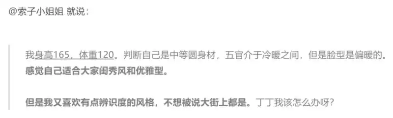 比如说尝试不一样的搭配,就会一直纠结:真的好看吗?别人会不会觉得俗气?会不会气质不对?