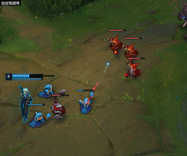 注意,我们钻进诺手Q内圈的动作不能通过“A诺手”的指令完成,必须点击诺手身后的地板。如果鼠标点击诺手,我们自己可能会在最大普攻距离进行攻击前摇,诺手稍后撤一点点就能让Q命中外圈。