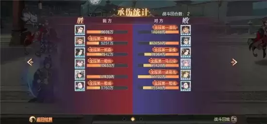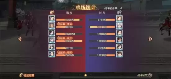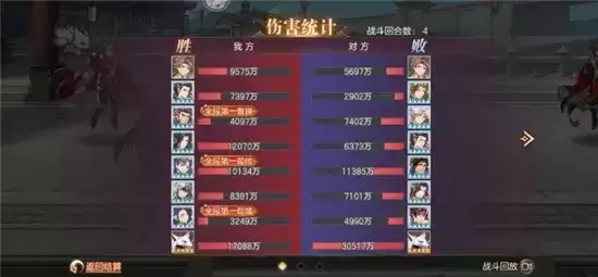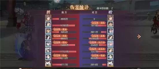 多核输出,阵容暴力。战斗成功拖入四回合,从承伤可以看出战况惨烈,魏国辅助将的回血远没有对方姜维邓艾吸血来的多,承伤方面惊人就不得不说到曹丕羁绊的减伤和福牛的盾起到了至关重要的作用。