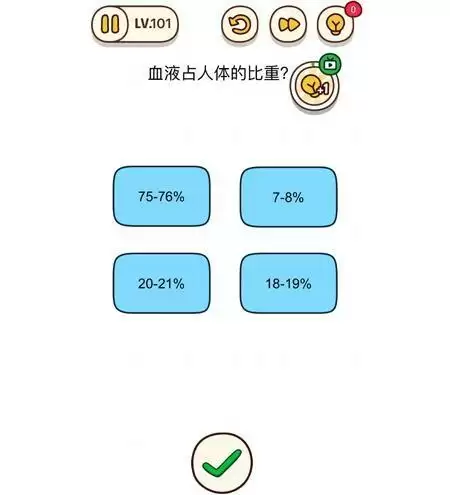 《烧脑大师》手游第101关【血液占人体的比重】怎么过呢?这一关是个选择题,下面是3DM手游网小编给大家带来的《烧脑大师》手游第101关通关攻略答案介绍,还不清楚具体如何过关的小伙伴一起看看吧。